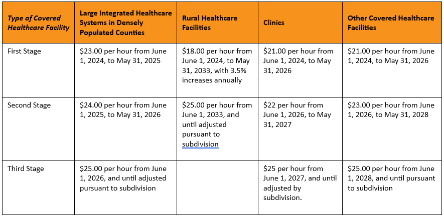 As outlined in the chart below, minimum wage requirements vary by type of healthcare employer, and increases are staged until all healthcare employees reach $25 per hour.